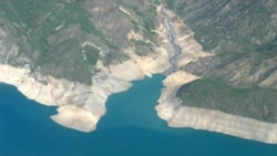 Сүрөттө Токтогул суу сактагычындагы суунун көлөмү азайып калгандагы көрүнүшү.