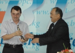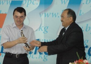 "Супер инфо" гезитинин баш редактору Кылычбек Султановго Өкмөттүн маалымат кызматынын өкүлү Болот Жумабаев сыйлык тапшырууда.
