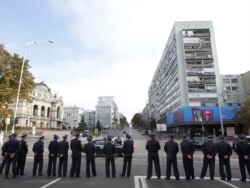 Президент Виктор Янукович Украинанын төбөлсүздүгүнүн 20 жылдыгында украиндердин руханий көсөмү, акын Тарас Шевченконун айкелине гүл чамбар кою салтанатына катышып жатканда, полиция кошумча күзөттө турат. Киев. 24-август 2011