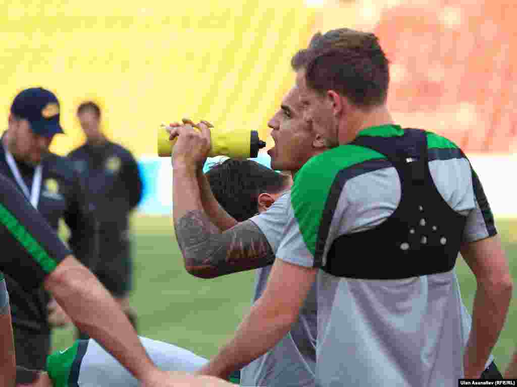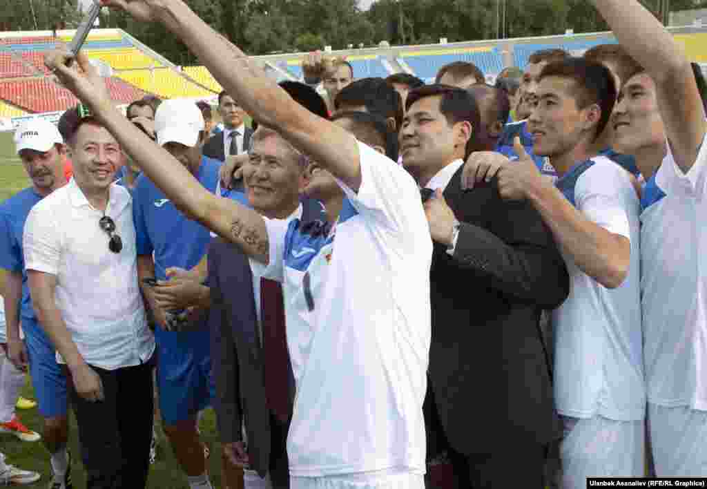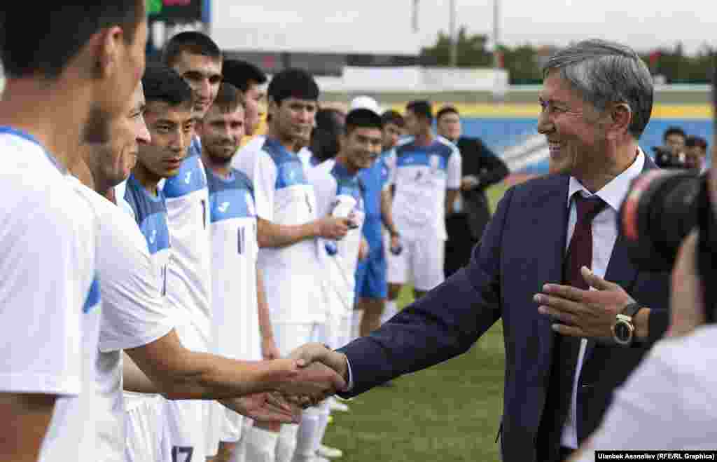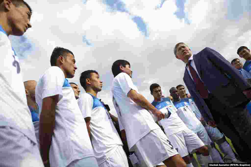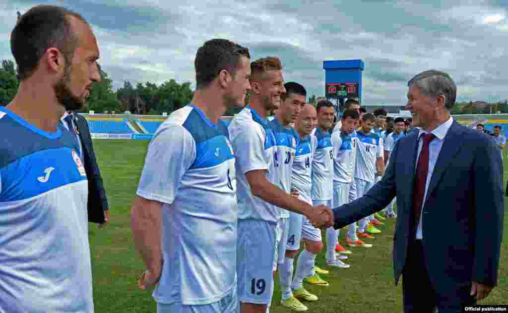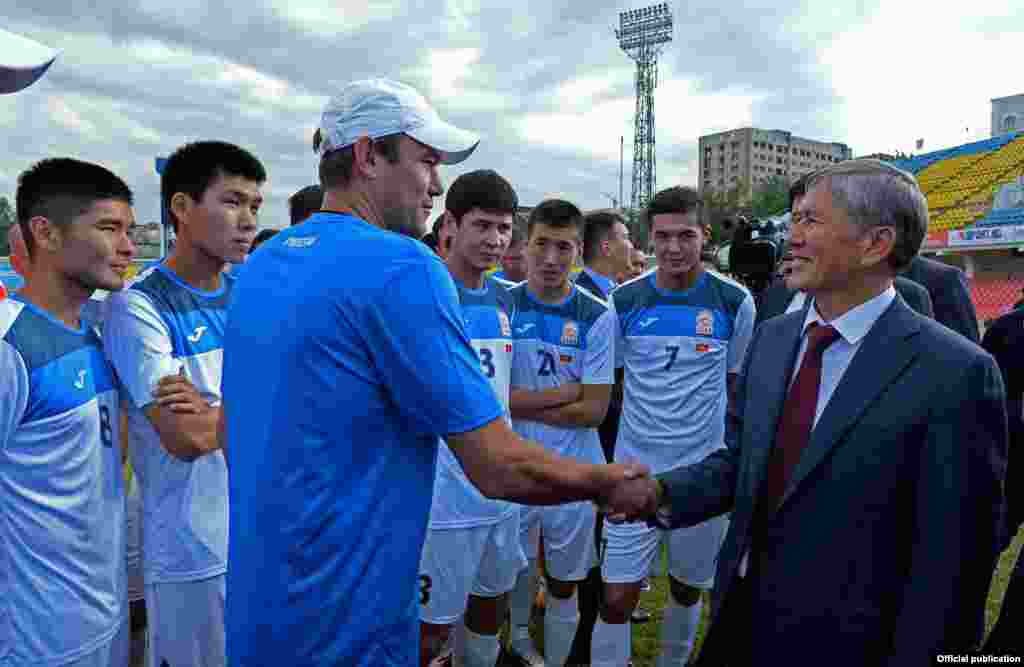 Президент Алмазбек Атамбаев Кыргызстандын улуттук курама командасынын даярдыгын көрдү. Өлкө башчысы улуттук курама командасына ийгилик каалап, алар эртең жеңишти камсыз кыларына ишенимин билдирди. Ошондой эле футбол командасы менен чогуу эстеликке сүрөткө түштү. 2018-жылдагы футбол боюнча дүйнө чемпиондугуна тандоо оюндарынын алкагында Кыргызстан менен Австралиянын беттеши Бишкектеги Дөлөн Өмүрзаков атындагы стадиондо кечки саат сегизде башталат. Буга чейин улуттук курама команданы колдоп, өкмөт башчы Темир Сариев мелдешке барарын билдирген.
