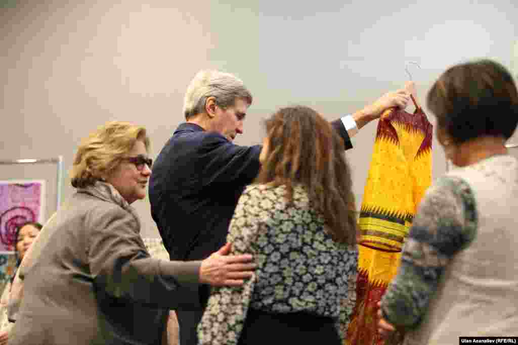 Имараттын ачылыш салтанатынан кийин Жон Керри АКШ элчилигинин жаңы имаратында өтүп жаткан көргөзмөдөн эки банка кыям менен эки куурчак сатып алды.