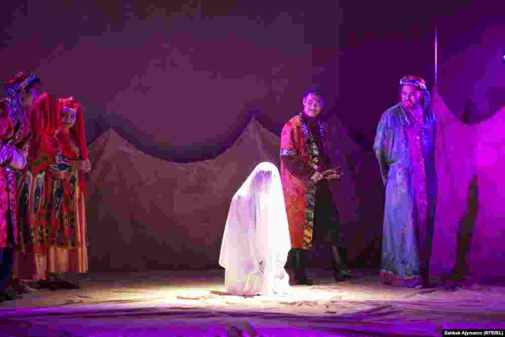 Оюн башталды. Сахнада мындан жүз жыл илгери тынчтык күндө өтүп жаткан кыргыз турмушу.