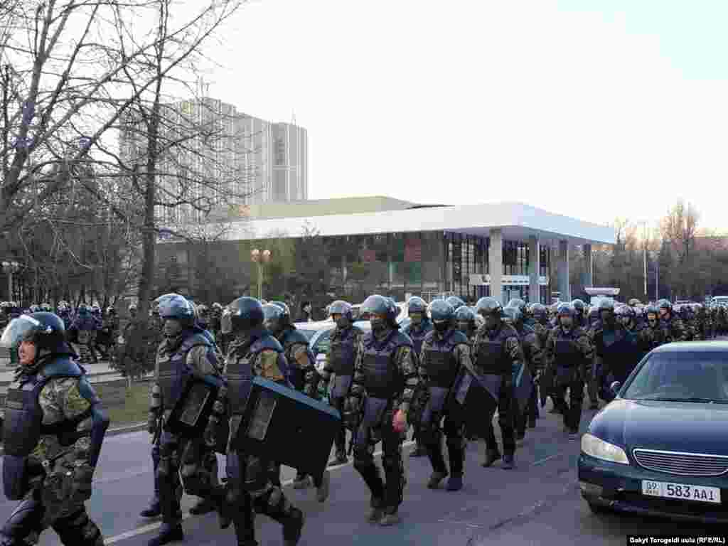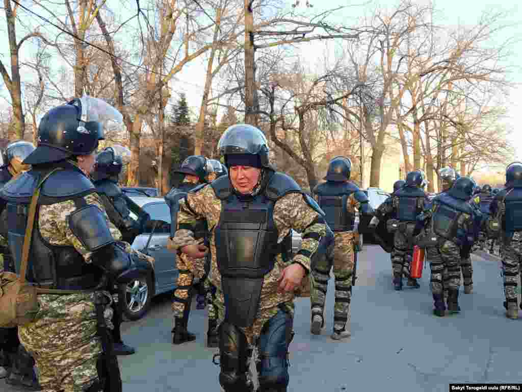 Атайын даярдыктагы күчтөр, милиция кызматкерлери суу бүркүп, көздөн жаш агызуучу газ колдонуп, кулак тундуруучу гранаталарды ыргытуу менен Ала-Тоо аятындагы жана Ак үйдүн алдындагы чогулган элди кууп таркатып жатат.