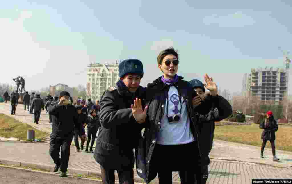 Бишкекте «Аялдардын шериктештик маршында» кармалгандар Свердлов райондук ички иштер бөлүмүнө алып келинди.