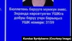 "Азаттыктын" кабарчысы Кундуз Кызылжарова Каракол шаарынан №3147 округунан добуш берүүгө аракет кылган. Ал каалаган участоктон добуш бергенде система кабыл албай турганын, системадан чыкпагандар көк болуп күйүп каларын билдирди.