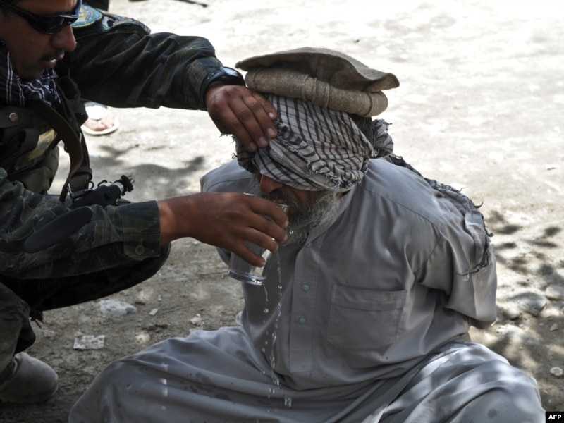 Ооган полициясынын кызматкери Кабылдагы согушта туткунга алынган талип жооккерине суу ичирүүдө. 2-июнь 2010