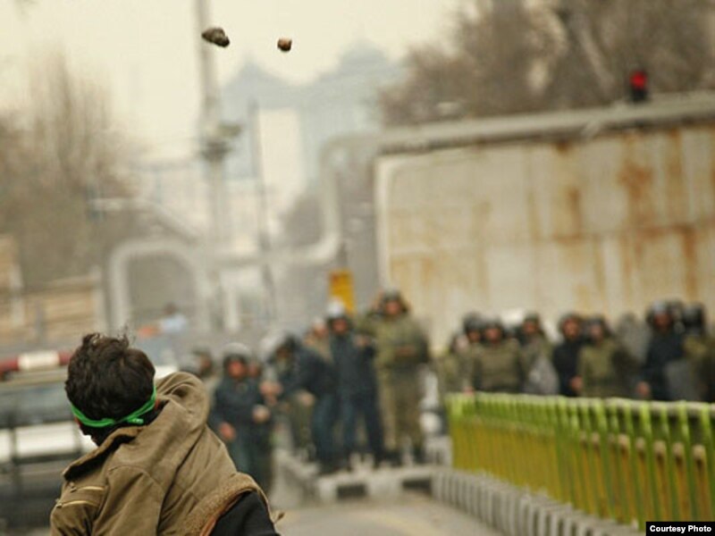 Оопозициянын тарапкерлери полициянын атайын күчтөрүн ташбараңга алышууда. Тегеран. 27-декабр, 2009-ж.