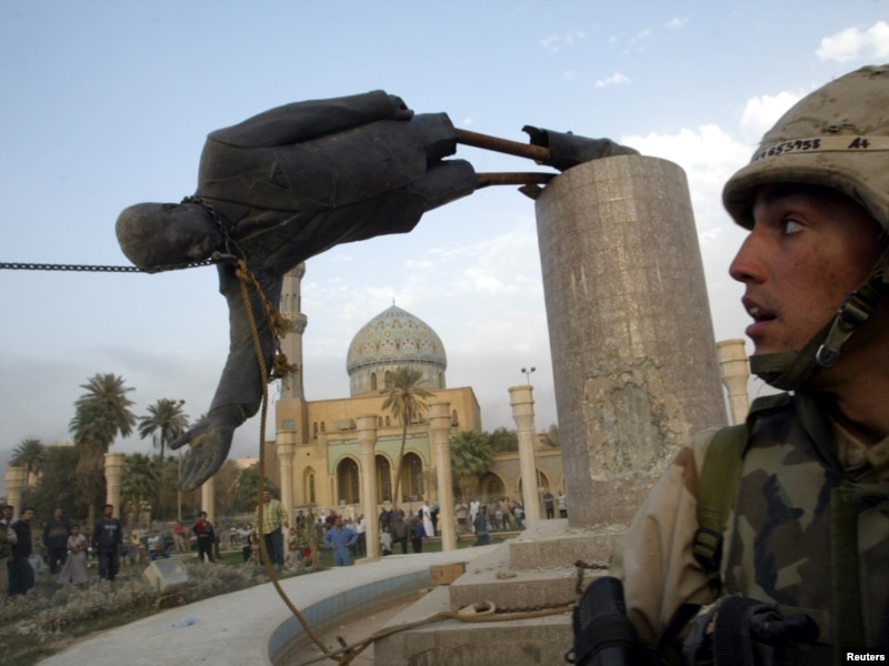 АКШлык жоокер Саддам Хусейндин кулатылган айкелине таңданып кароодо. Багдад. 9-апрель 2003