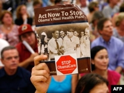 Cаламаттыкты сактоо тармагын реформалоо боюнча жыйындын катышуучусу президент Обама менен Адоль Гитлердин сүрөтү бар плакатты кармап турат. 25-август. Рестон, Виржиния штаты.