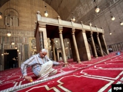 Каирде XIV-кылымда курулган Султан Хасан атындагы мечиттин кызматкери АКШ президенти Барак Обама келер алдында килемди тегиздеп салууда. 2-июнь 2009-ж.