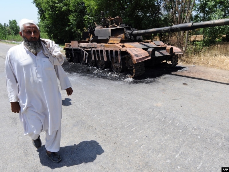 Талип согушчандары кыйрткан Пакистан армиясынын танкы. Бунер аймагындагы Пир Баба кыштагы. 22-май 2009