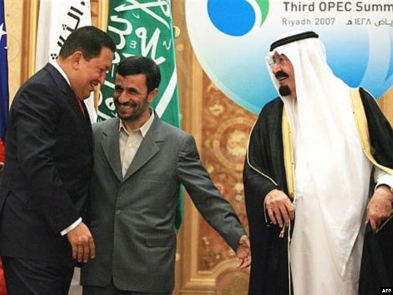 Венесуэланын президенти Уго Чавес (солдо), Ирандын президенти Махмуд Ахмадинежад (ортодо) жана Саудиянын падышасы Абдулла бин Абдул Азиз. Эр-Рияд. 17-ноябрь, 2007