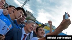 Президент Атамбаев менен команда мүчөлөрүн сүрөткө тартып жаткан, бүгүнкү мелдештеги 3-топтун ээси Азамат Байматов