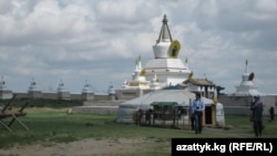 Ошентип сапар уланып, жолдо катар көк түстөгү жибек чүпүрөктөргө чулганган аса таяктарды жолуктуруп жүрүп отурдук. Буддага сыйынган монголдун бул белгилерин теңирчиликке өзүн жакын сезген кыргыздын мазарына окшоштурдук.