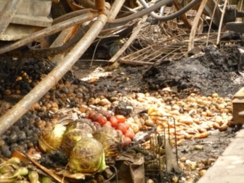 Сатуучу аял күйүп кеткен товарын көрсөтүүдө.
