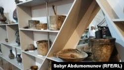 Музейди негиздегендердин бири, жетекчиси Абдинаби Кадыров чакан жайга топтолгон экспонат, буюм жана материалдардын ар биринин тарых-таржымалын түшүндүрүп берүүдө.