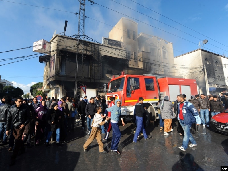 Ал бозгундукка качаар замат ишембиге караган түнү борбор шаар Тунисте тополоңдор жана талап-тоноолор орун алды, башкы темир жол бекети өрттөлдү.