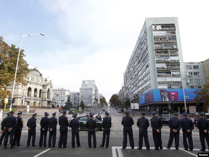 Президент Виктор Янукович Украинанын төбөлсүздүгүнүн 20 жылдыгында украиндердин руханий көсөмү, акын Тарас Шевченконун айкелине гүл чамбар кою салтанатына катышып жатканда, полиция кошумча күзөттө турат. Киев. 24-август 2011