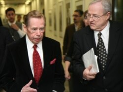 Вацлав Гавел мурдагы "Эркин Европа" үналгысынын чех кызматынын башчысы Павел Пехачек менен бирге ЭЕ/АҮ башкеңсесинин жаңы имаратын кыдырууда. 2009-жылдын 27-марты, Прага ш.